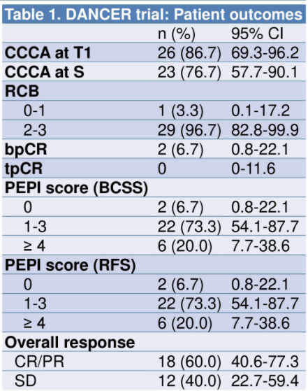 因此,我们设计了一项小样本的单臂临床研究——DANCER研究。DANCER是一项基于循环肿瘤DNA(ctDNA)指导的单臂、II期临床试验,旨在评估达尔西利联合芳香化酶抑制剂作为可手术HER2阴性Luminal B型乳腺癌新辅助治疗方案的临床活性。我们的研究发现,新辅助治疗后2周(T1)达到了86.7%(26/30)的完全细胞周期阻滞(CCCA)率(主要终点),这是Luminal B型乳腺癌患者新辅助内分泌治疗中CCCA率非常理想的状态。然而,研究中仍有部分患者的临床反应不佳。