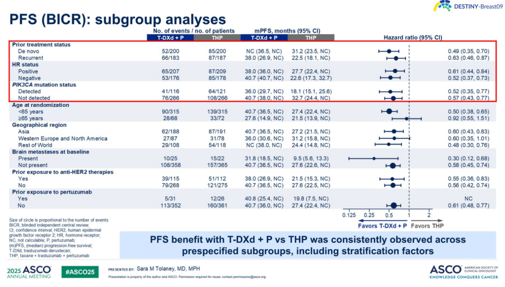 2025年ASCO大会重磅揭晓的全球多中心Ⅲ期DB-09研究,成功挑战了HER2阳性晚期乳腺癌当前一线治疗标准THP方案。研究结果超出预期,无论是在总体疗效、风险比还是各亚组分析结果方面,都展现了优异的临床获益。结果显示,T-DXd/DS-8201a联合帕妥珠单抗组的中位无进展生存期(PFS)达到40.7个月,较THP方案显著降低44%的疾病进展或死亡风险。该研究结果意义重大,将T-DXd从后线治疗推进到一线治疗,将对临床实践产生重要影响,未来在经济条件允许的情况下,可能会有更多患者在一线治疗中考虑使用T-DXd。