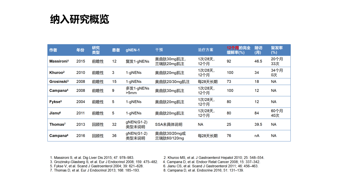 该研究采用相关关键词进行计算机文献检索,识别过去15年中发表的所有相关文献。最终纳入8项涉及SSA治疗1型g-NENs的研究。该研究发现,SSA治疗1型g-NENs的完全缓解率约为25-100%。当只考虑其中6项前瞻性研究时,各研究间无显著异质性,患者累积完全缓解率高达84.5%(置信区间73.8-92.8)。其中3项研究评估了1型g-NENs在使用SSA 12个月,停药后的复发情况,中位随访34个月后,累积复发率为30.2%(置信区间13.1-50.6)。