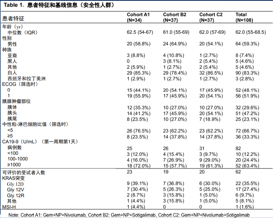 II期研究的主要终点为各组患者1年总生存率,与单纯化疗的历史生存率数据(35%)对比,次要终点包括治疗安全性、ORR、疾病控制率(DCR)、无进展生存期(PFS)、缓解持续时间(DoR)等,并设置免疫药效学和生物标志物的探索性终点。患者整体基线特征如表1所示,各组间患者基线特征平衡,肿瘤基因表达、肿瘤免疫情况、免疫特征和肠道微生物富集程度等肿瘤基线特征和免疫分析也基本平衡,与此前已发表的PDAC相应数据一致。