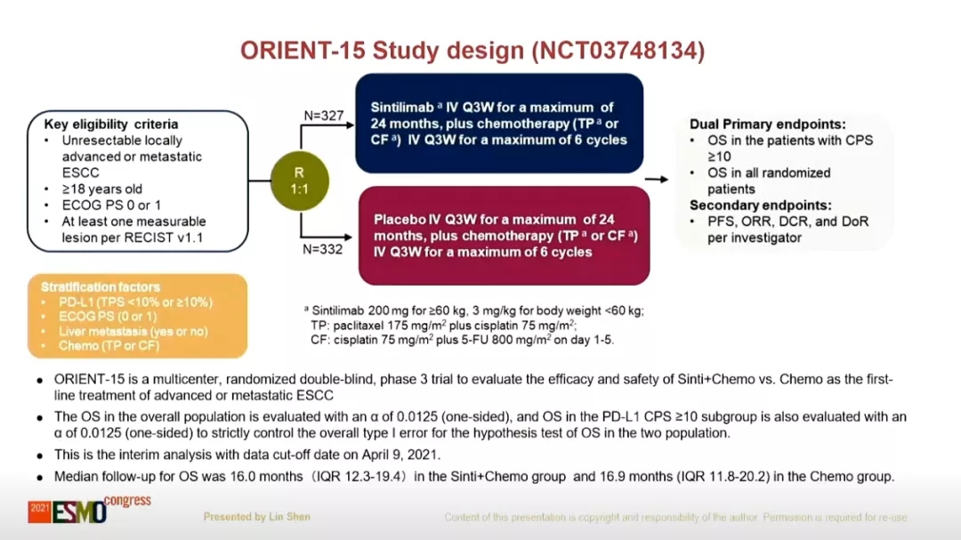 ORIENT-15研究首次结果:信迪利单抗联合化疗一线治疗晚期或转移性食管鳞癌显著改善OS和PFS(摘要编号:LBA52)