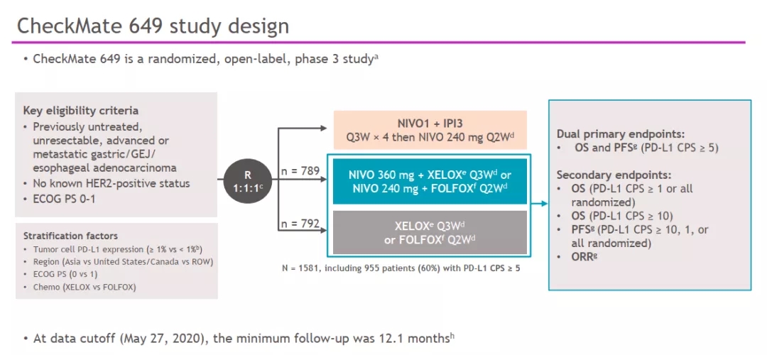 CheckMate -649是一项全球多中心、随机对照、开放标签、三臂设计的III期临床研究,旨在评估与单独化疗相比,以纳武利尤单抗为基础的方案用于治疗既往未接受过治疗的晚期或转移性胃癌、胃食管连接部癌或食管腺癌患者的疗效。