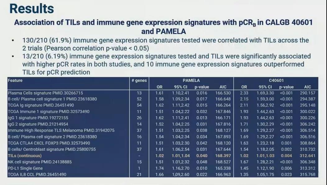 TILs和免疫基因表达特征与pCR的相关性结果是:2项试验中,130/210(61.9%)检测的免疫基因表达标记与TILs相关。13/210(6.19%)检测的免疫基因表达标记和TILs与较高的pCR率显著相关。10个免疫基因表达特征对pCR的预测优于TILs,CALGB 40601中检测到TILs和免疫基因表达标记均与RFS相关。