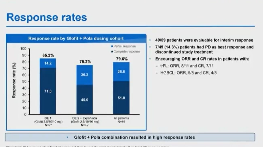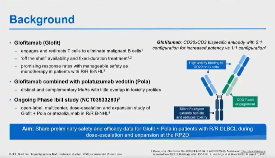 首先介绍的是一项采用双抗(Glofitamab)联合CD79b的ADC药物Polatuzumab Vedotin(Pola)针对复发/难治弥漫大B细胞淋巴瘤的Ⅰb/Ⅱ期临床研究(大会摘要号:525)。Glofitamab是非常重要的抗-CD3和抗-CD20的双抗药物,在之前的Ⅰ期研究已经显示出它对复发难治B细胞淋巴瘤具有一定的挽救治疗价值。同时,联合的药物Pola本身是一种针对CD79b的ADC药物,该项研究主要就是为了验证这两个药物联合的疗效及安全性。