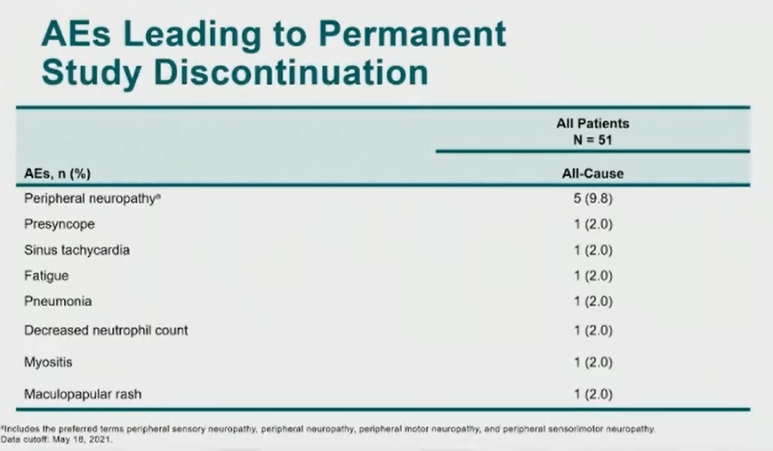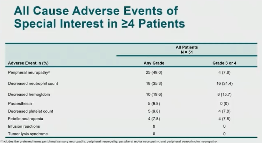 对于安全性角度来讲,大概64%的患者获得了3级或者4级的不良事件,治疗相关的不良事件的比例在3,4级来讲大概是47%,没有治疗相关的死亡AE事件的发生。从毒性分布图上看最常见的毒副反应主要是外周神经病变,包括疲劳及消化道反应,我们非常关注3,4级的AE,大概有30%的患者获得了中性粒细胞的缺乏,其他的3,4级的毒副反应的发生率都不超过10%。对我们特别需要关注的不良事件,最主要的还是在外周神经病变和骨髓抑制,特别是中性粒细胞的缺乏。大概只有不到10%的患者因为各种AE导致了治疗中断。