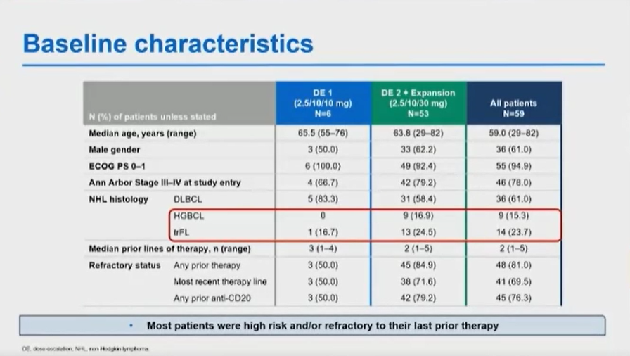 这个研究经过了短期的剂量爬坡进入到扩展阶段。共59例难治/复发弥漫大B细胞淋巴瘤接受了联合治疗的临床研究。从组织学类型来看,61%的患者是弥漫大B细胞淋巴瘤,15%的患者是高级别B细胞淋巴瘤,另外还有23%的患者是滤泡细胞淋巴瘤转化而来。这些患者既往的治疗80%都有疾病进展,而且70%的患者对于最近的治疗都有耐药,76%的患者接受过抗CD20单抗药物治疗。