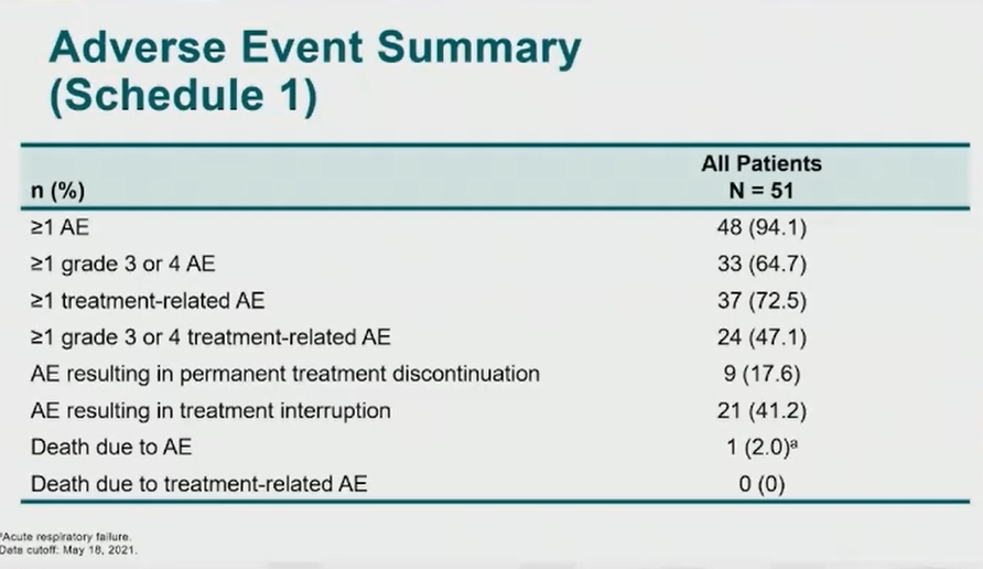 研究最终纳入100例患者,从患者的基线特征可以看出,多数既往接受了多线标准治疗,整体来说是标准的复发难治人群。结果显示,无论是每3周还是每周方案都显示了比较好的治疗顺应性。同时,从安全性的角度来说,主要的毒副反应为骨髓抑制,它的总体发生率是可控的,也没有严重的导致治疗相关性的死亡事件。