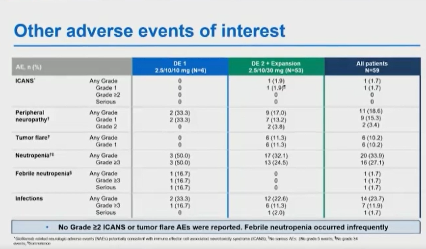 从整体的安全性来讲,91%的患者获得了不同程度的毒副反应,但3~4级的AE(不良事件)的发生率为57%,总体来讲这个组合还是非常安全的。另外45%的患者发生了不同程度的严重不良事件(SAE),主要是来自于这个双抗所产生的,大概42%的患者发生了细胞因子释放综合征(CRS),但绝大部分都是1级和2级的反应。其他反应包括神经毒性以及外周神经病变,肿瘤快速进展发生率都是相对比较低,而且是可控的。