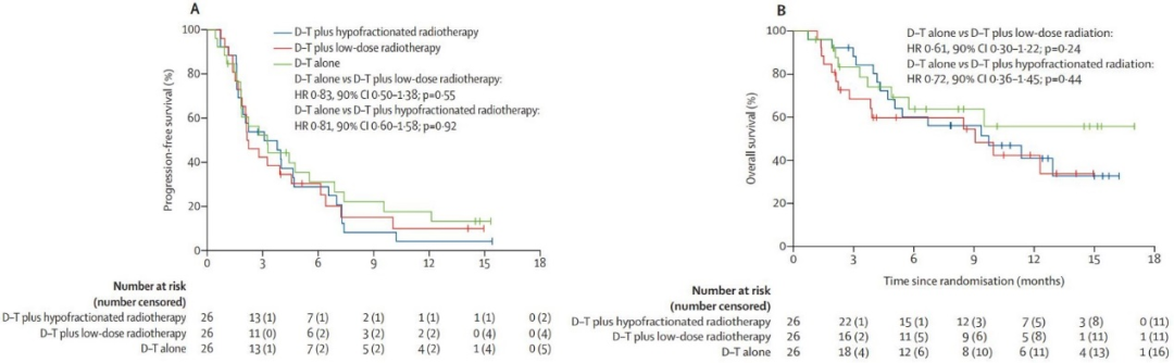 从2017年8月至2019年3月,共计90例患者完成筛查,78例患者入组,每组均有26例患者,三组患者基线特点均衡可比。在中期分析时,由于P值未达到预先设定的水准,因此研究被提前终止。全组患者中,32%的患者既往接受过非免疫治疗,最常见的放射治疗部位分别为:肺62%、淋巴结15%、肝脏12%、肾上腺10%。单纯免疫治疗组、低剂量放疗组及大分割组,ORR别为11.5%、7.7%和11.5%,差异无统计学意义。