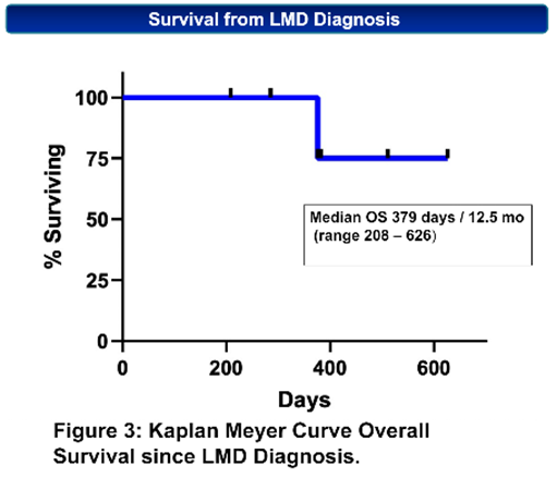 6例患者(100%)都获得了临床获益, 5例(83.3%)患者获得了MRI客观反应。患者的平均治疗周期为6.5(5-23)个周期。T-DXd治疗的中位持续时间为160天(125-514),6个患者中有4个患者(66.7%)接受了持续治疗。从开始接受T-Dxd治疗到死亡或最后一次随访的中位生存期为264天(146-514)。从最初诊断为软脑膜转移到死亡或最后一次随访的中位生存期为379天(208-626)。该研究也为T-Dxd在乳腺癌软脑膜转移患者以及其他HER2+肿瘤类型中进行前瞻性评估提供了理论依据。