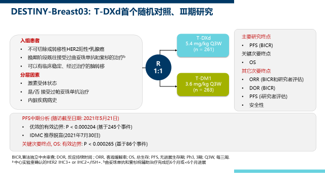 在T-DXd首个随机对照、Ⅲ期的DESTINY-Breast03研究中,纳入临床稳定、经过治疗的脑转移患者。