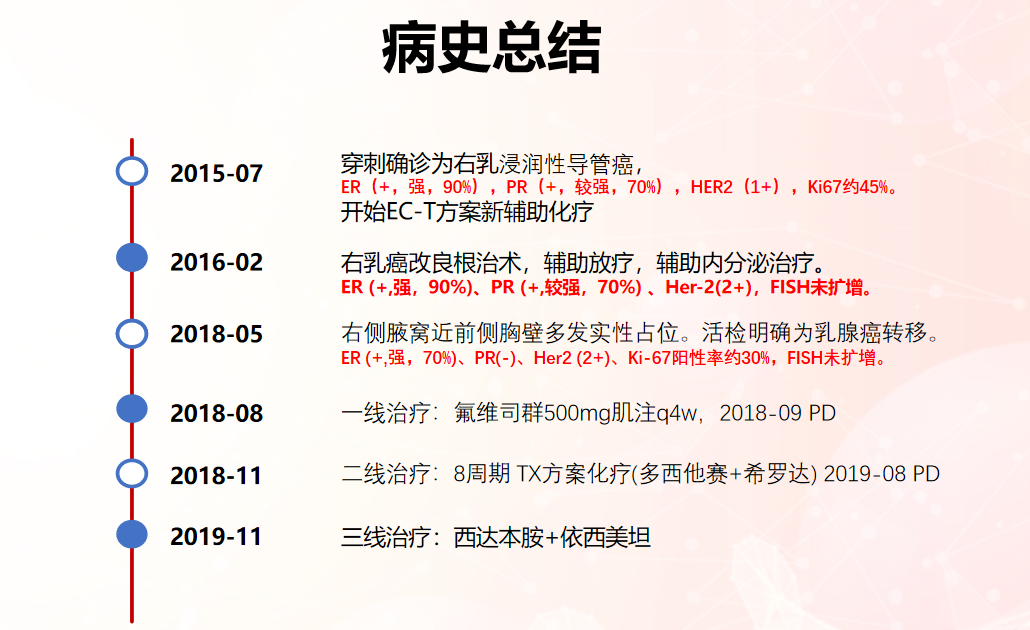 王涛教授:该患者转移前ER、PR均为强阳性,HER2阴性,转移后也为ER强阳性,按照当前的指南和规范,大家都会推荐患者使用CDK4/6抑制剂联合内分泌治疗的方案,因为患者目前没有内脏危象,仅有软组织转移,既往内分泌治疗敏感(来曲唑治疗两年后复发)。但患者复发转移时间在2018年,考虑当时CDK4/6抑制剂在我国不可及,基于这个原因,我也会考虑内分泌治疗,在当时环境下,有mTOR抑制剂可选择,如果患者由于经济原因或其他因素不可用,我也会推荐患者单用内分泌治疗(考虑SERD药物氟维司群)。