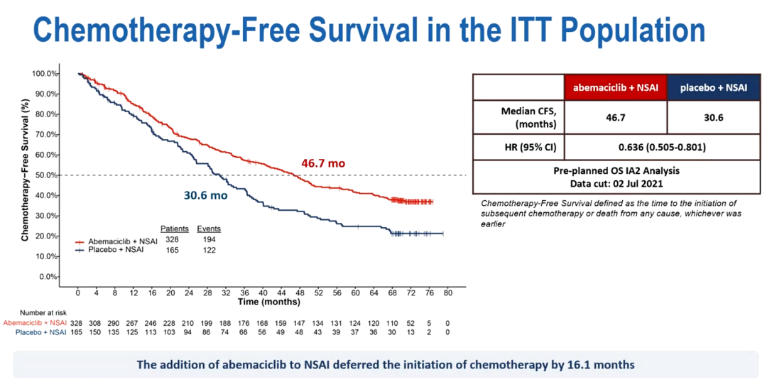 结论:MONARCH 3研究的第二次中期分析显示,无论意向治疗人群还是内脏转移亚组,在NSAI基础上联合阿贝西利一线治疗可使HR+/HER2- ABC患者OS延长1年以上,目前数据尚未成熟,未达统计学差异,预计在2023年(ITT人群至少315个事件、内脏转移亚组至少189个事件)进行最终分析。此外,阿贝西利可推迟患者无化疗生存时间,在长期随访中安全性良好。