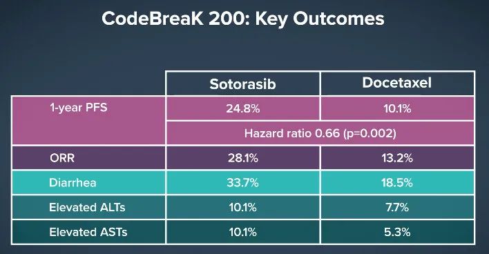 III期CodeBreak 200是一项对比Sotorasib和多西他赛用于KRAS G12C突变晚期经治NSCLC患者的研究。中位随访17.7个月后,Sotorasib相比多西他赛使患者的无进展生存期(PFS)得以改善,1年PFS率分别为24.8%和10.1%(HR=0.66;95%CI:0.51-0.86;p=0.002)。Sotorasib改善了无进展生存期,但总生存期数据尚待研究(摘要#LBA10)。