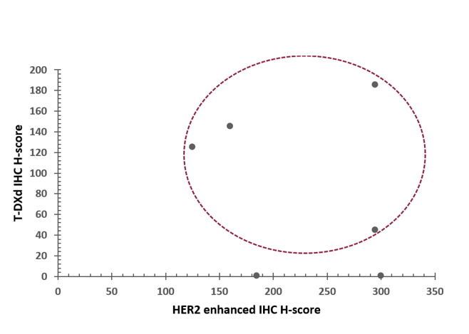 尽管HER2的表达随着T-DXd的治疗进展而下降,但没有强有力的证据表明T-DXd的摄取是发生耐药的主要机制。疾病进展时,在4/6例患者中观察到T-DXd分布,其中2例患者观察到HER2表达水平的下降。