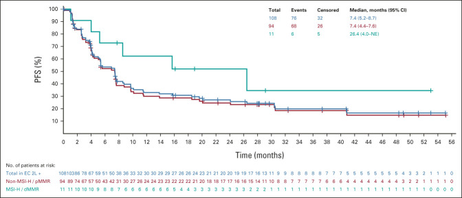 无论组织学亚型或MMR状态如何,患者均有肿瘤缓解。在更新的数据中,患者被分入非微卫星高度不稳定(non-MSI-H)/错配修复正常(pMMR;n=94)亚组以及MSI-H/错配修复缺陷(dMMR;N=11)亚组。两组患者的中位PFS分别为7.4个月(95%CI:4.4~7.6)和26.4个月(95%CI:4.0~NE),ORR分别为38.3%(36例)和63.6%(7例)。non-MSI-H/pMMR患者的中位OS为17.2个月(95%CI:15.0~25.8),MSI-H/dMMR患者的中位OS为NE(95%CI:7.4~NE)。此外,non-MSI-H/pMMR肿瘤患者的中位DOR为23.0个月(95%CI:8.5-NE),而MSI-H/dMMR肿瘤患者的中位DOR为21.2个月(95%CI:7.3-NE)。研究者指出,在4年时,两个亚组的DOR仍处于较高范围。