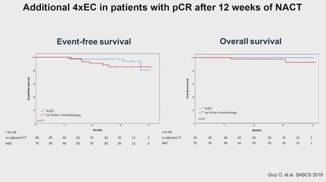 ADAPT-TN试验纳入了336例早期TNBC患者,新辅助治疗方案为12周白蛋白紫杉醇联合吉西他滨,或白蛋白紫杉醇联合卡铂,术后继续使用4周期表阿霉素联合环磷酰胺辅助化疗。SABCS 2018公布的数据表明,在达到pCR的患者中,辅助化疗并未改善患者的iDFS;因此提出对于这部分患者不应继续给予化疗。并且该研究的探索性分析发现,相对于PD-1表达较低的患者,PD-1表达较高者具有更好的生存结局。未来可根据pCR或其他肿瘤分子特征(例如PD-1)选择治疗方案,使患者预后更佳。