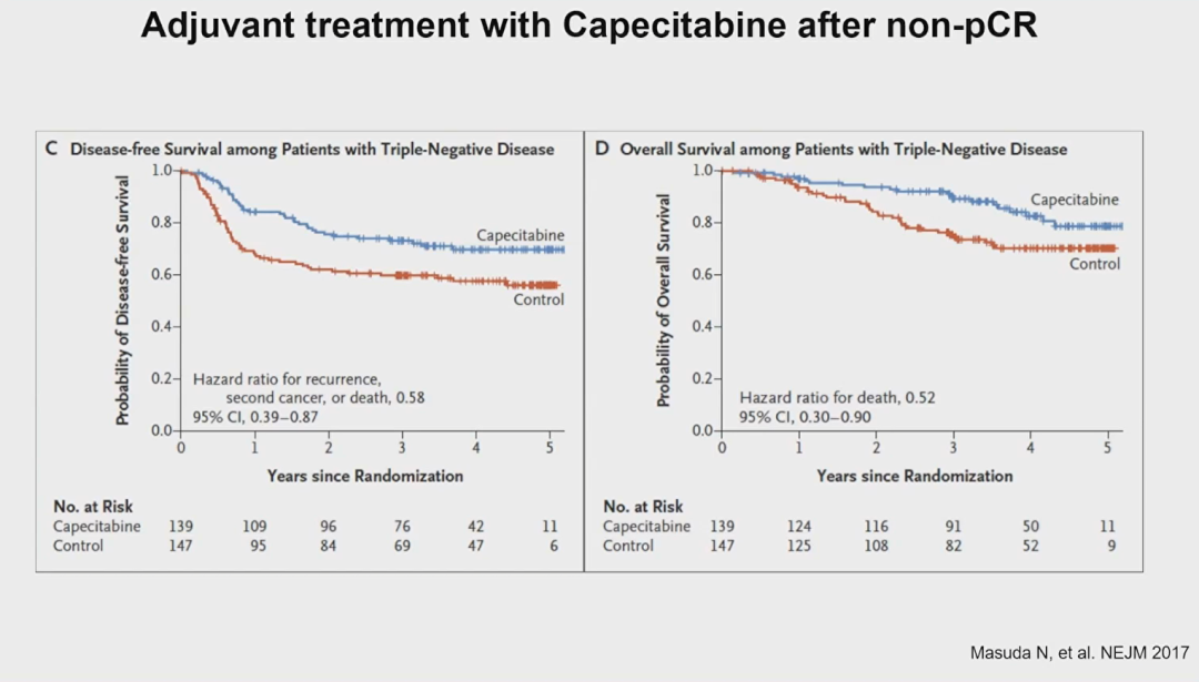 CREATE-X研究表明,对于新辅助治疗未达pCR的TNBC患者,术后给予6~8个周期卡培他滨辅助强化治疗,显著提高了5年无病生存期和总生存期。