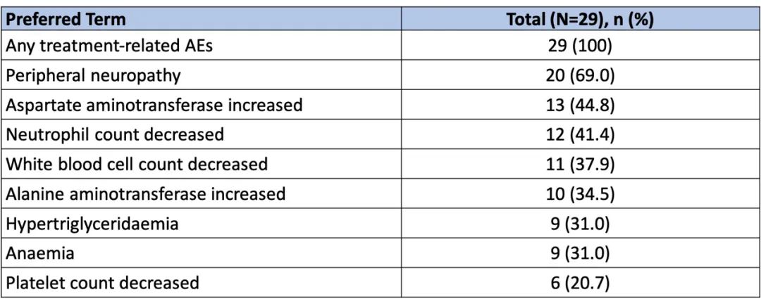 最常见的治疗相关不良事件见表2。最常见的≥3级治疗相关不良事件(TRAE)(≥10%)是周围神经病变(15/29,51.7%)。研究期间未发现间质性肺疾病。9例患者因周围神经病变停止研究治疗。2例患者因住院治疗发生与治疗相关的严重不良事件:周围神经病变。