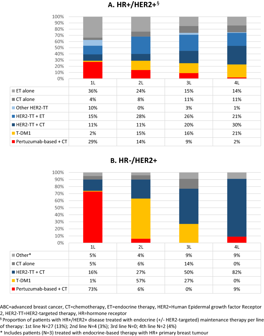 在2013-2018年筛选入组330例HER2+ABC患者,其中211例(64%)为HR+/HER2+,119例(36%)为HR-/HER2+。在一线使用全身治疗的HR+/HER2+患者中,估计有70%~80%的继续二线治疗,51%~66%三线治疗,33%~54%四线治疗。在一线治疗的HR-/HER2+患者中,估计二线继续治疗率为61%~78%,三线为30%~61%,四线为14%~50%。在四线治疗中,患者年龄、合并症(任何或心血管疾病)、WHO体能状况、(新)辅助全身治疗和无转移间隔时间(MFI)组间类似。但每次的后续治疗,转移部位数量都会增加,尤其是HR+/HER2+患者。