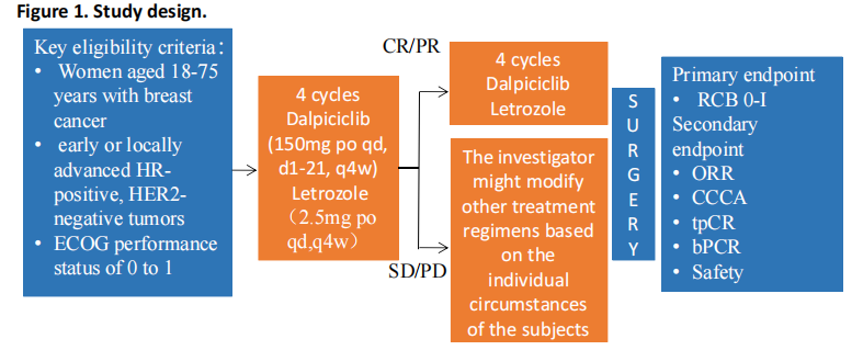 本研究采用多中心、单臂、开放设计,入组ECOG评分为0~1的早期或局部晚期HR+/HER2-女性乳腺癌患者。患者入组后首先接受4个周期的达尔西利(150 mg po qd,d1-21,q4w)联合来曲唑(2.5 mg po qd,q4w)进行新辅助治疗,每2个周期复查乳腺MRI。根据RECIST1.1标准评估,4个周期后若疗效确切CR/PR患者,继续接受4个周期的达尔西利联合来曲唑;若疗效稳定(SD)或疾病进展(PD),由研究者视受试者实际情况更改其他治疗方案。主要研究终点是肿瘤残余负荷(RCB0-I比率),次要研究终点ORR、CCCA(C1D15 Ki67≤2.7%)的比例及安全性等。