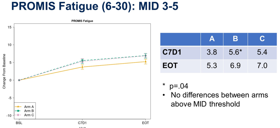 对于PROMIS疲劳评分,组间并未超过临床重要差异阈值。